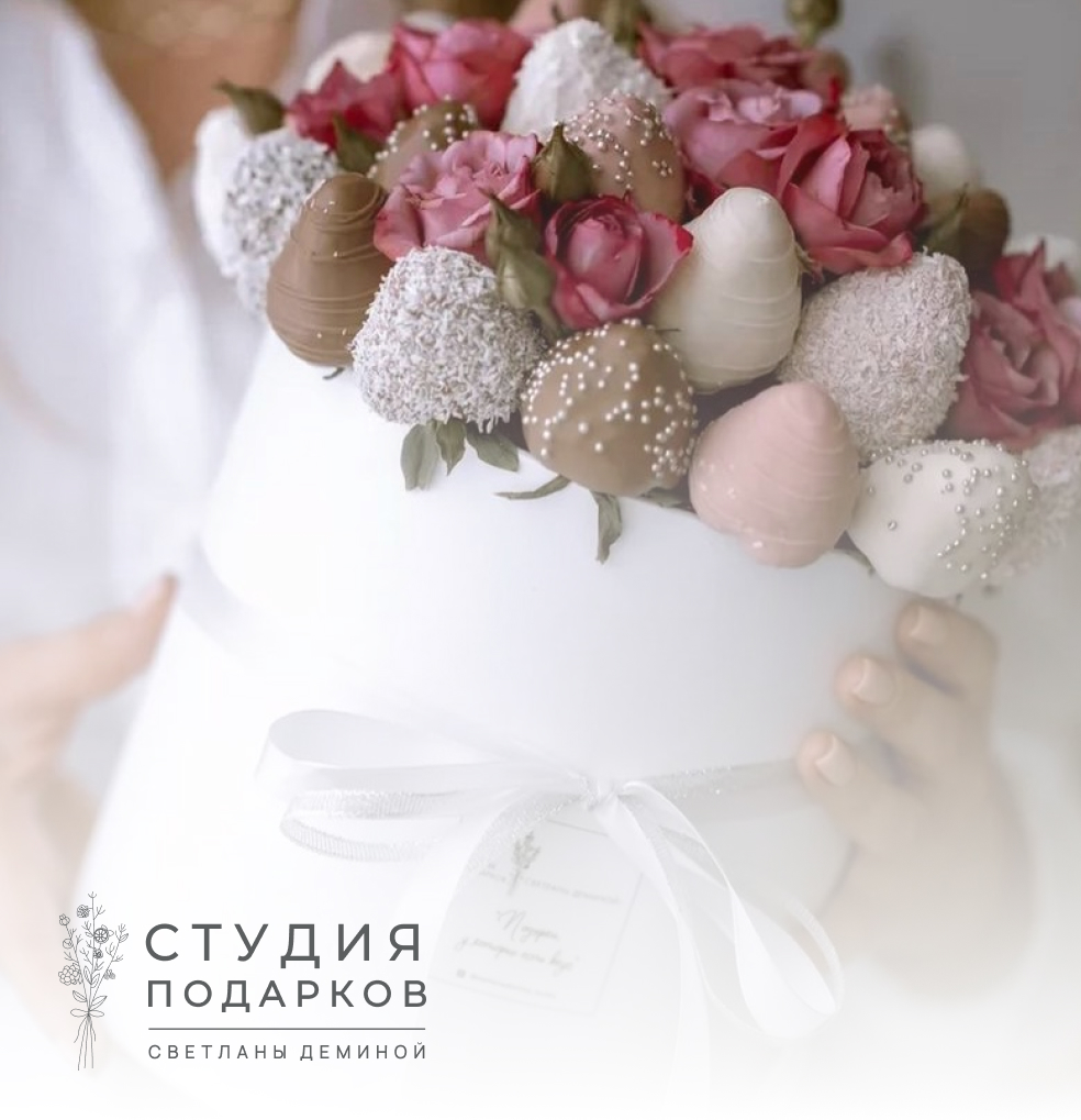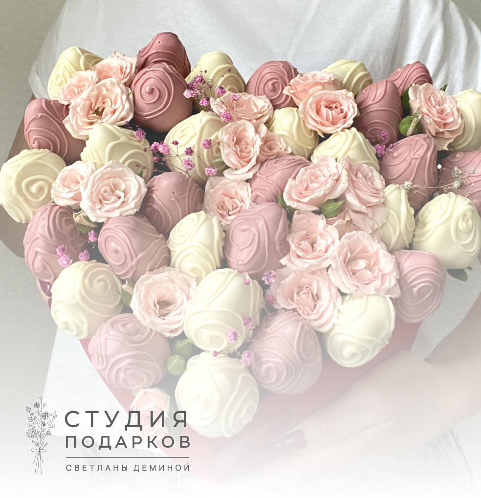 Стильная корзина со свежей клубникой в бельгийском шоколаде. Используется несколько видов шоколада, 50% клубники покрыто шоколадом, 50% нет. В декоре ягод используются натуральные компоненты, которые раскрывают и дополняют вкус, а также добавляют визуальное оформление композиции. В качестве акцентов добавляются цветы кустовой розы.